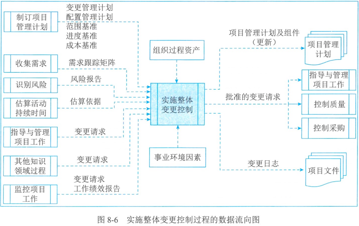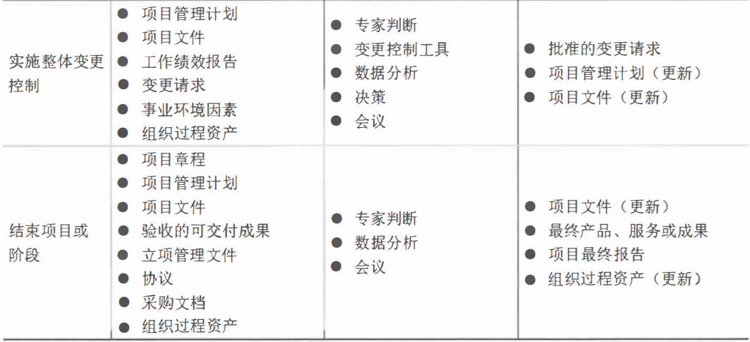 | 实施整体变更控制 | 批准的变更请求、项目管理计划更新、项目文件更新 | 专家判断、变更控制工具、数据分析、决策、会议 | 项目管理计划、项目文件、工作绩效报告、变更请求、事业环境因素、组织过程资产 |
