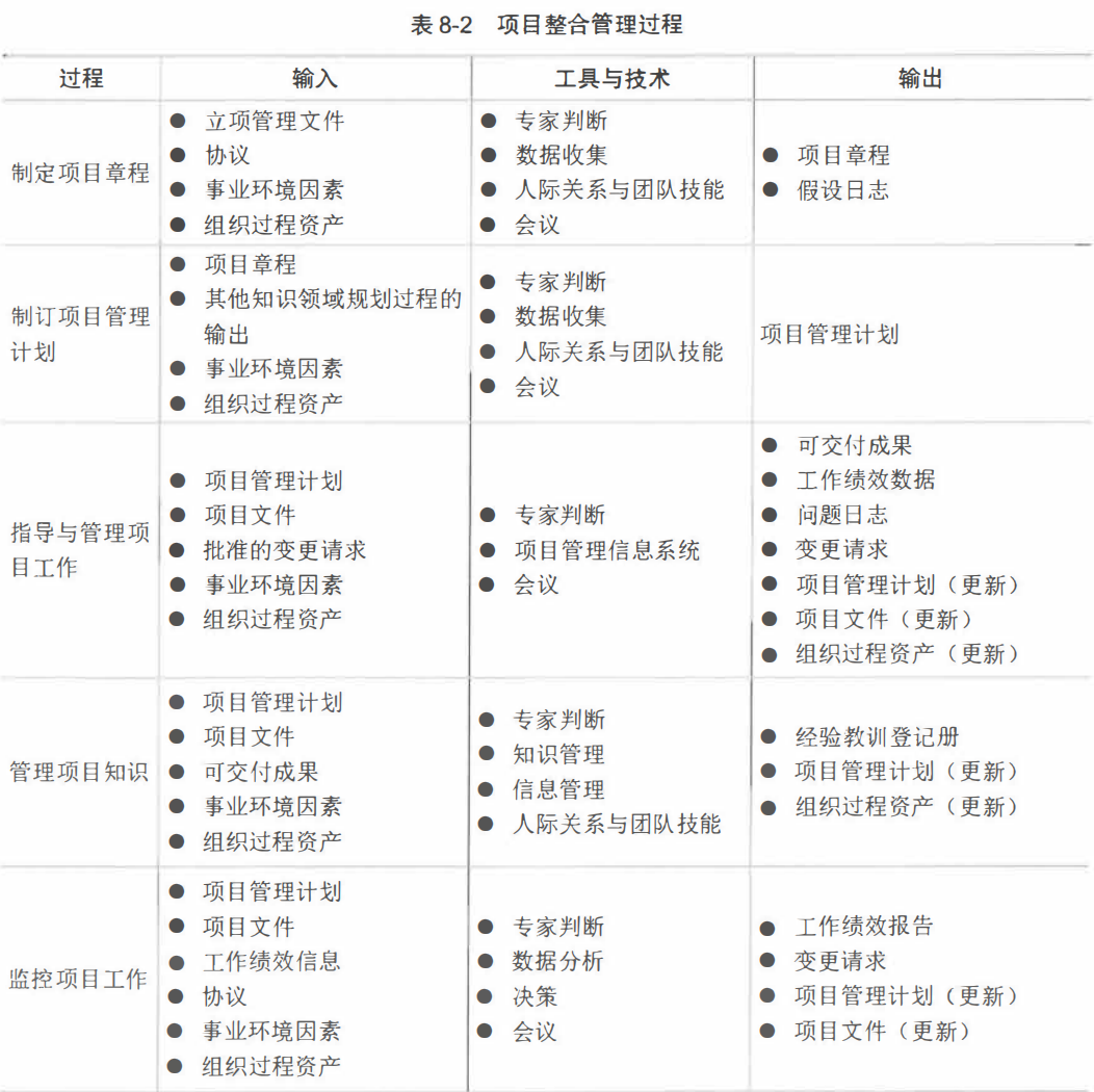 表8-2概括了项目整合管理的各个过程: