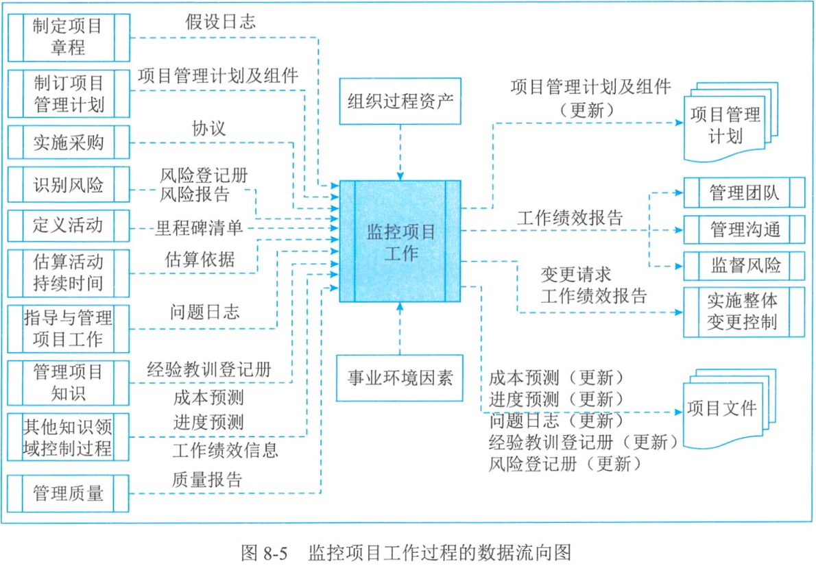 | 监控项目工作 | 工作绩效报告、变更请求、项目管理计划更新、项目文件更新 | 专家判断、数据分析、决策、会议 | 项目管理计划、项目文件、工作绩效信息、协议、事业环境因素、组织过程资产 |