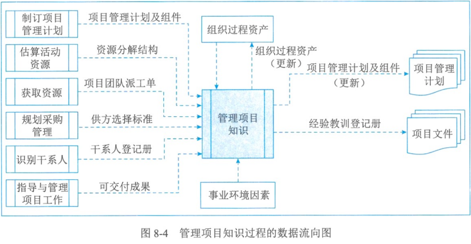 | 管理项目知识 | 经验教训登记册、项目管理计划更新、组织过程资产更新 | 专家判断、知识管理、信息管理、人际关系与团队技能 | 项目管理计划、项目文件、可交付成果、事业环境因素、组织过程资产 |