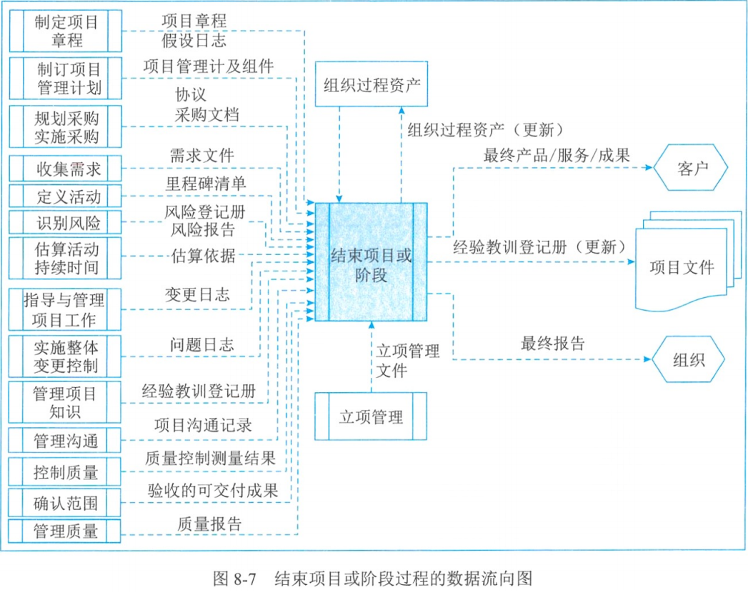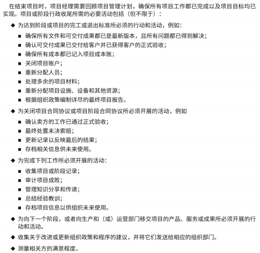 结束项目或阶段是终结项目、阶段或合同的所有活动的过程。