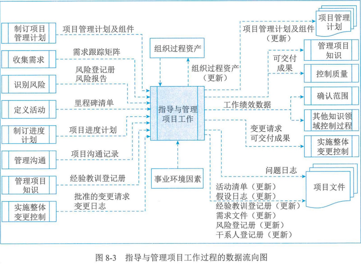 | 指导管理项目工作 | 可交付成果、工作绩效数据、问题日志、变更请求、项目管理计划更新、项目文件更新、组织过程资产更新 | 专家判断、项目管理信息系统、会议 | 项目管理计划、项目文件、批准的变更请求、事业环境因素、组织过程资产 |