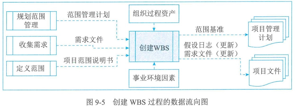 | 创建WBS | 范围基准、项目文件更新 | 分解、专家判断 | 项目管理计划、项目文件、事业环境因素、组织过程资产 |
