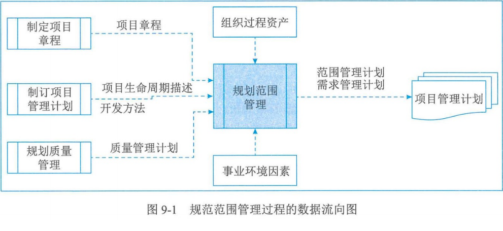 | 规划范围管理 | 范围管理计划、需求管理计划 | 专家判断、数据分析、会议 | 项目章程、项目管理计划、事业环境因素、组织过程资产 |