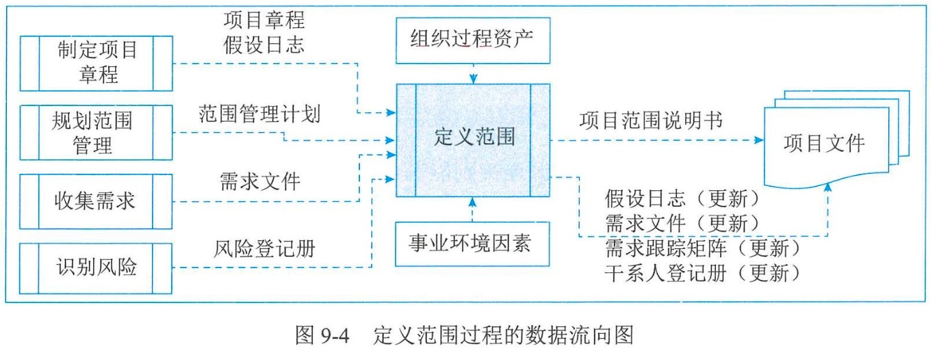 | 定义范围 | 范围说明书、项目文件更新 | 专家判断、数据分析、决策、人际关系与团队技能、产品分析 | 项目章程、项目管理计划、项目文件、事业环境因素、组织过程资产 |
