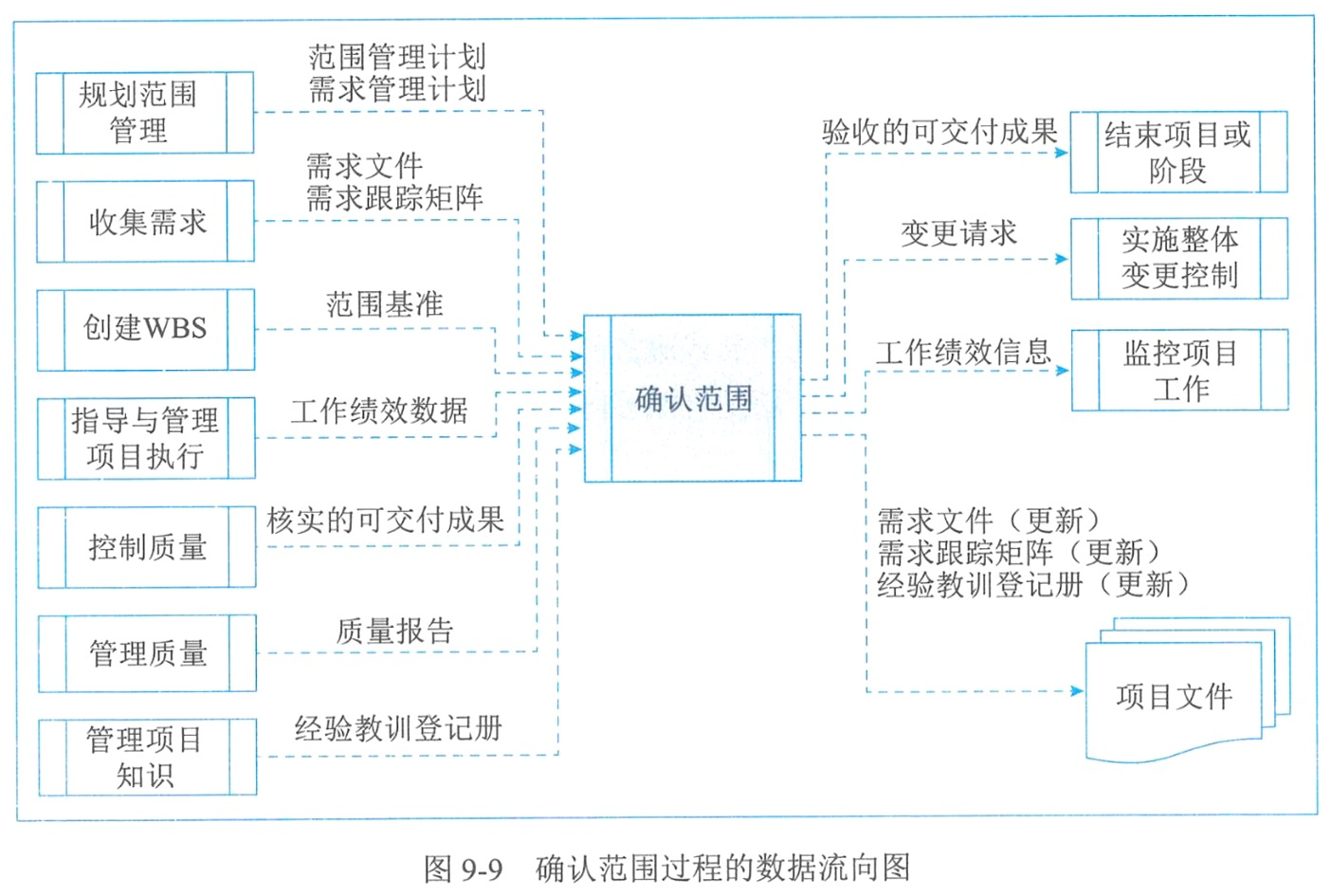 | 确认范围 | 验收的可交付成果、变更请求、工作绩效信息、项目文件更新 | 检查、决策 | 项目管理计划、项目文件、工作绩效数据、核实的可交付成果 |