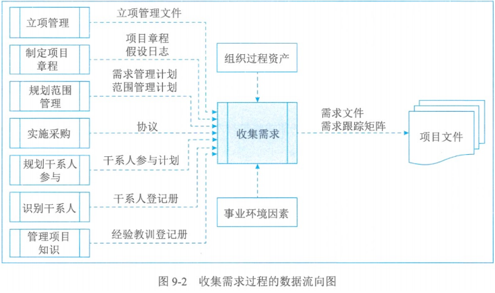 | 收集需求 | 需求文件、需求跟踪矩阵 | 专家判断、数据收集、数据分析、决策、数据表现、人际关系与团队技能、系统交互图、原型法 | 立项管理文件、项目章程、项目管理计划、项目文件、协议、事业环境因素、组织过程资产 |