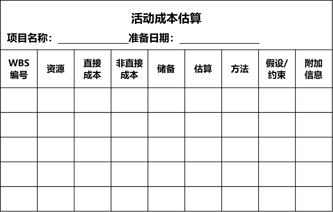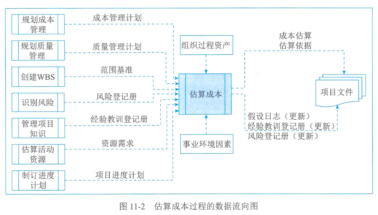 | 估算成本 | 成本估算、估算依据、项目文件更新 | 专家判断、类比估算、参数估算、自下而上估算、三点估算、数据分析、项目管理信息系统、决策 | 项目管理计划、项目文件、事业环境因素、组织过程资产 |