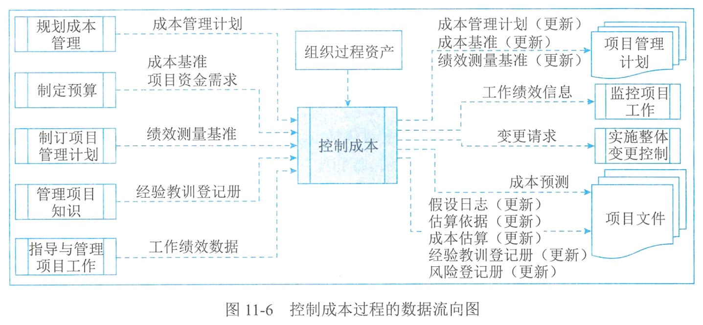 | 控制成本 | 工作绩效信息、成本预则、变更请求、项目管理计划更新、项目文件更新 | 专家判断、数据分析、完工尚需绩效指数、项目管理信息系统 | 项目管理计划、项目资金需求、项目文件、工作绩效数据、组织过程资产 |