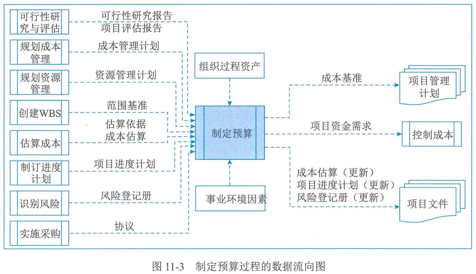 | 制定预算 | 成本基准、项目资金需求、项目文件更新 | 专家判断、成本汇总、数据分析、历史信息审核、资金限制平衡、融资 | 项目管理计划、可行性研究文件、项目文件、协议、事业环境因素、组织过程资产 |