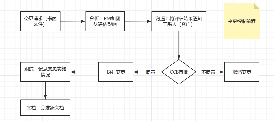 变更的三要素:书面申请,审批和确认,跟踪变更过程。
